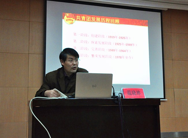 温晓林首先带领大家回顾了共青团的四个发展阶段:创建阶段、探索发展阶段,完善阶段和繁荣发展阶段。他讲到今年是建团第95周年,在当今优越的生活条件下,广大共青团员仍不可忘记陈独秀,李大钊等革命前辈为创立共青团所立下的汗马功劳,应当系统学习团的基本知识,并结合中国共产主义青年团的性质,告诫学生“不忘初心,继续前进。”