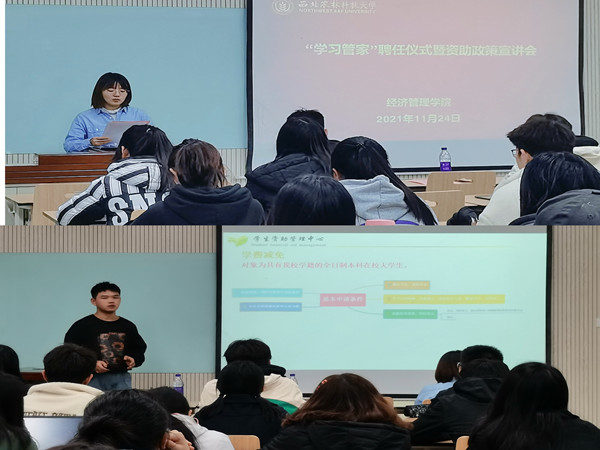 为践行资助育人理念,聚合朋辈学业互助资源,营造良好学习风气,做好学业困难学生的帮扶工作,同时为帮助2021级新生深入了解学校资助政策,11月24日,学院举办“学习管家”聘任仪式暨资助政策宣讲会,资助管理中心王辉、学院资助专员常小文、“学习管家”代表以及2021级学习委员参加本次活动。