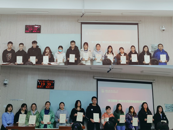 会上,常小文老师宣读了学院关于聘任姚远等41名“学习管家”的决定,并介绍了朋辈辅导学习班开设课程、开课时间,“学习管家”的职责及课程安排等情况,同时鼓励“学习管家”们担起责任,帮助存在学业困难的同学改善学习方法,提高学习成绩,养成良好的学习习惯,切实解决同学们学业上的困难。随后,常小文老师、王辉老师为“学习管家”颁发聘书。2019级学生孙华蔚谈到:在我的求学过程中,获得过各类奖助学金,感受到了国家、社会和学校的爱,希望通过朋辈辅导学习班将这份爱传递下去,积极与学弟学妹们交流,分享自己学习心得和学习方法。