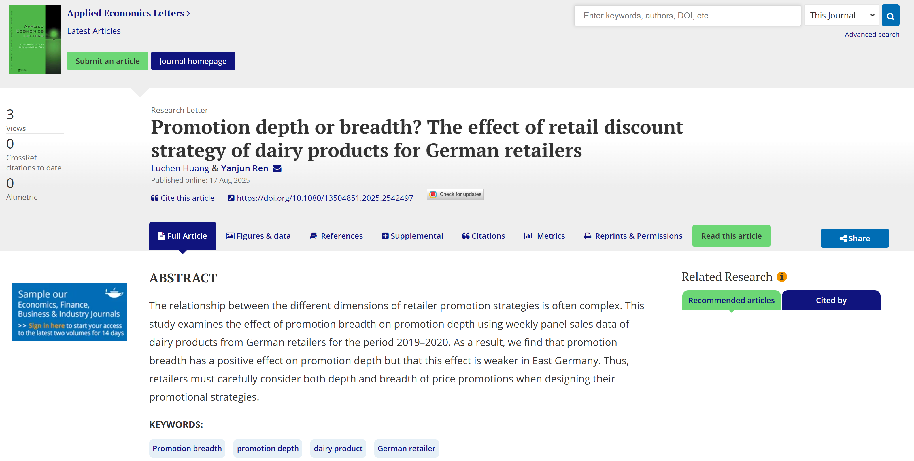 近期,西北农林科技大学经济管理学院任彦军教授课题组在《Applied Economics Letters》发表最新研究成果,论文题目为“Promotion depth or breadth? The effect of retail discount strategy of dairy products for German retailer”。任彦军教授为论文通讯作者,黄禄臣博士生为论文第一作者。