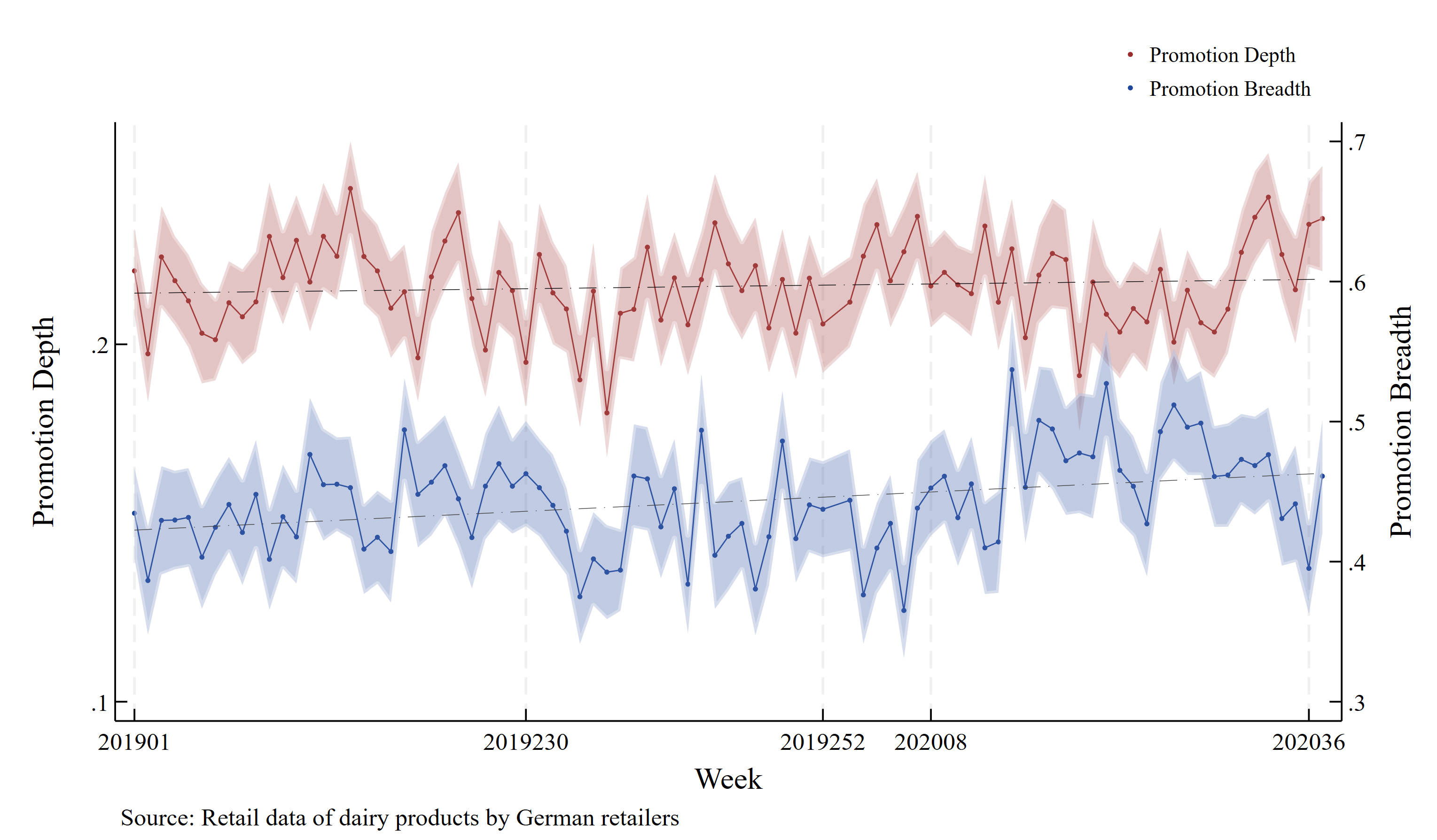 在食品零售行业中,价格促销是吸引消费者和提升销量的关键手段,其中促销深度(折扣幅度)与促销广度(参与促销的产品比例)是两大核心维度。但二者关系究竟是替代还是互补,一直缺乏实证检验。为此,基于2019年第1周至2020年第36周德国150家零售商的周度面板数据,该研究以乳制品为例,实证检验了促销广度对促销深度的影响。研究结果显示,促销广度对促销深度具有显著正向作用:促销品类越多,折扣幅度也越大,二者呈现互补效应。同时,异质性分析表明,这一效应在东德地区相对较弱。研究认为,零售商在制定促销方案时,应兼顾促销深度与广度的协调,以避免消费者对价格促销变得不敏感。