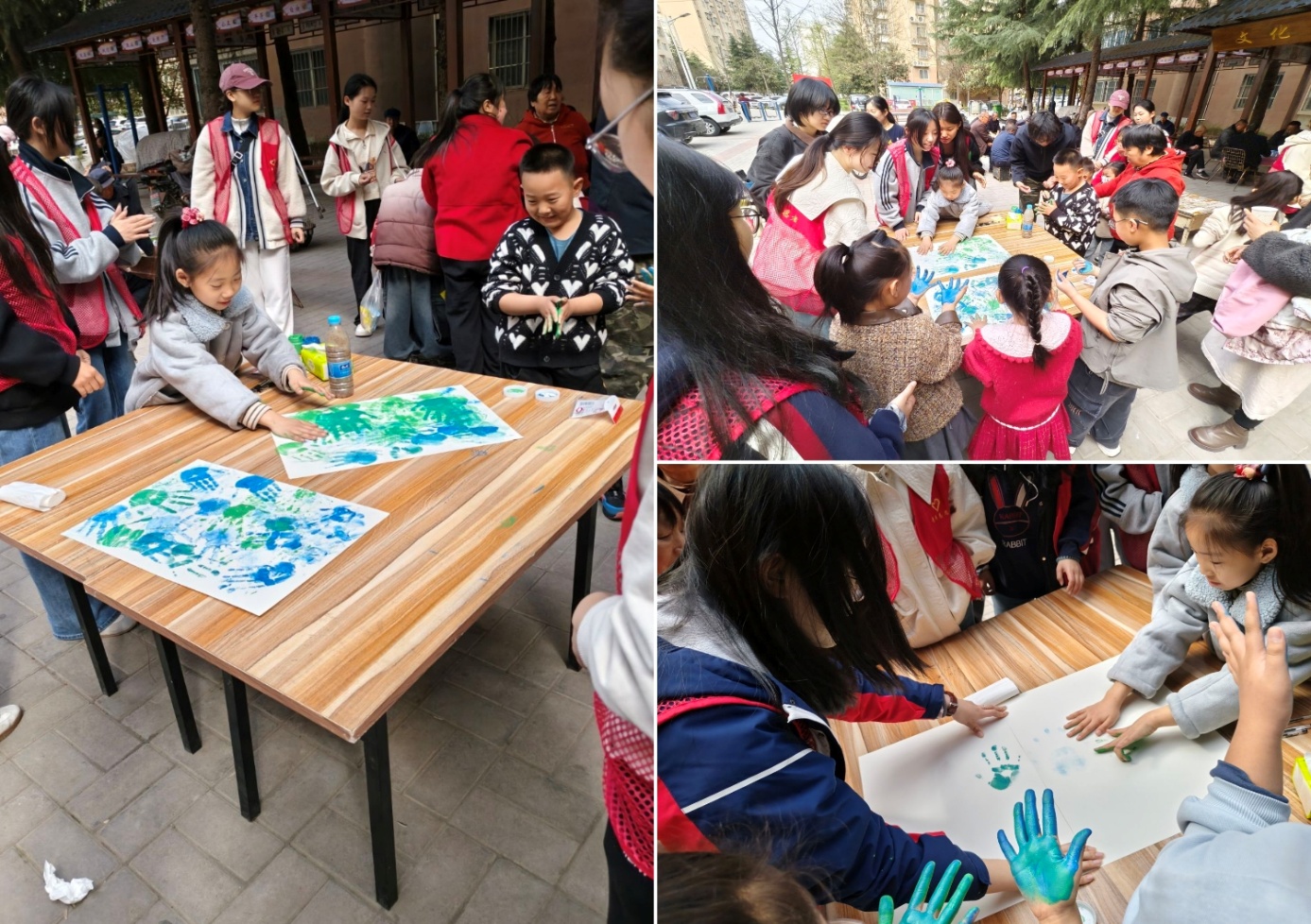 活动最后,志愿者与孩子们共同开启“节水承诺手印树”创意工坊活动。志愿者提前备好画好树干与枝丫的大幅画纸,孩子们用蓝色、绿色颜料按下手印,化作一片片 “树叶” 缀满枝头,在树枝上留下属于自己的专属印记。随后,志愿者协助孩子们在手印旁写下自己力所能及的节水小行动,让每一枚手印都成为一份郑重的节水承诺。这棵满载童真与约定的“承诺树”,也将作为世界水日主题宣传的长效载体,持续提醒大家珍惜每一滴水资源,践行每一件向善小事。