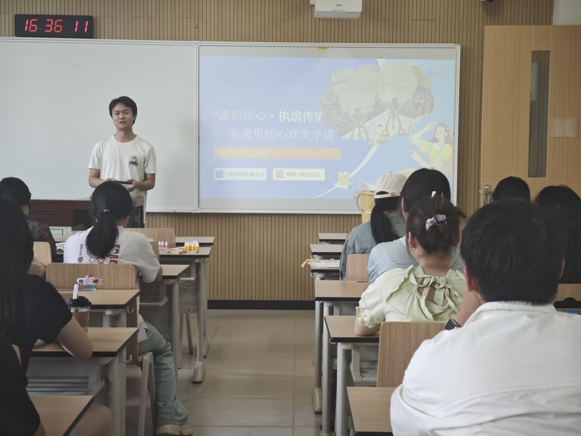 漆香阵阵,扇韵悠悠。5月21日下午,经济管理学院心理权益部联合“智汇经纬”文体活动体验坊,在南校一号教学楼成功开展“漆韵绘心·执扇传情”非遗心理美学体验活动,60余名同学在非遗漆扇的魅力中,感受千年技艺的文化底蕴,体验漆墨流彩的心灵疗愈。