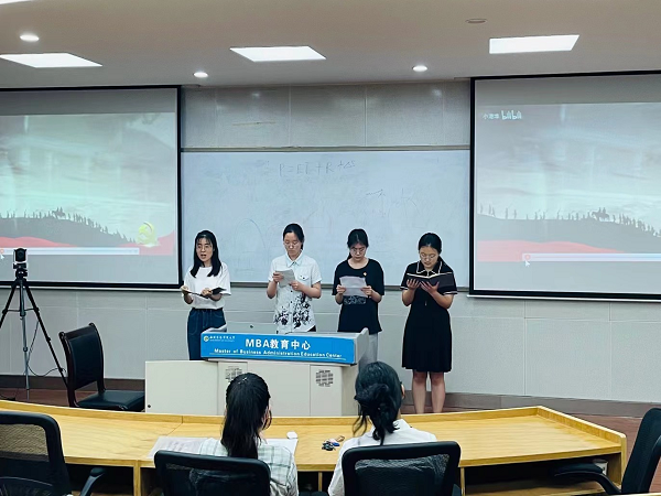 会议伊始,由孙威晴、刘儒、杨琰伦、管金融等同志进行诗歌朗诵。伴随着慷慨激昂的背景音乐,四位同志以真挚的情感、饱满的热情、抑扬顿挫的声音诵读了《红船,从南湖起航》这部经典诗歌作品,带领支部党员回顾革命艰辛、感受峥嵘岁月,从伟大建党精神中汲取青春奋进力量。当她们朗诵到“雄鸡一样形状的土地,终于发出了黎明的报晓,一轮鲜红的太阳,从未有过今天的辉煌”时,感情充沛饱满,将现场氛围推向高潮,让支部同志们产生了强烈的情感共鸣,一起感悟红色历史,坚定理想信念,勇担时代使命。